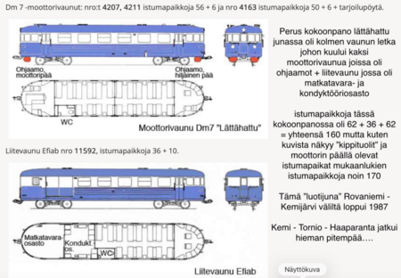 Toki vielä jälkihuomautuksena voi mainita "laituri seisakkeet" ? Jääskeläinen, Kirkonkangas ja Ounasvaara/kisapysäkki, unohtamatta että Rovaniemen ensimmäinen rautatieasema (1909) ei ole enää radan varrella..(Poromiehentiellä) Yllämainitut tiedot ei ole kiveen hakattuja argumenttejä ja tietoja saa oikaista/kommentoida etusivulle tai tämän sivun alaosan palaute "laatikoihin" joka on toivottavaa. Etupäässä tietoja on luettu ja "kuviteltu" Jussi Iltasen RADAN VARRELLA kirjasta joka on näiden asioiden suhteen erittäin mielenkiintoinen teos, kannattaa lukea.... ps. Mainitaan nyt sekin että sodanjälkeen isohaaran silta oli poissa käytöstä ja tilapäisesti Rovaniemen asema "osoitteellisesti" sijaitsi Ylivieskassa....! 5.5.2013 RK ............................................. ViiMEiNEN LÄTTÄHATTU VUORO Rovaniemeltä - Kemijärvelle 29.5.1988 (Rohkenen epäillä että vuosi on ollut 1987 päivä määrä ? Kuljettaja Juoppei S, ja Kond Toivanen K) Asia täytynee varmistaa..?6.6.2021 RK (Rovaniemen torille ilmestyi/karkasi lättähattu ilman pyöriä)